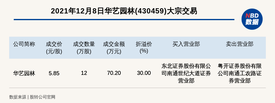每经讯,2021年12月8日,新三板创新层公司华艺园林(430459)发生一笔大宗交易,成交价5.85元/股,成交数量12万股,成交金额70.20万元,溢价30%。买入营业部是东北证券股份有限公司南通世纪大道证券营业部,卖出营业部是粤开证券股份有限公司南通工农路证券营业部。