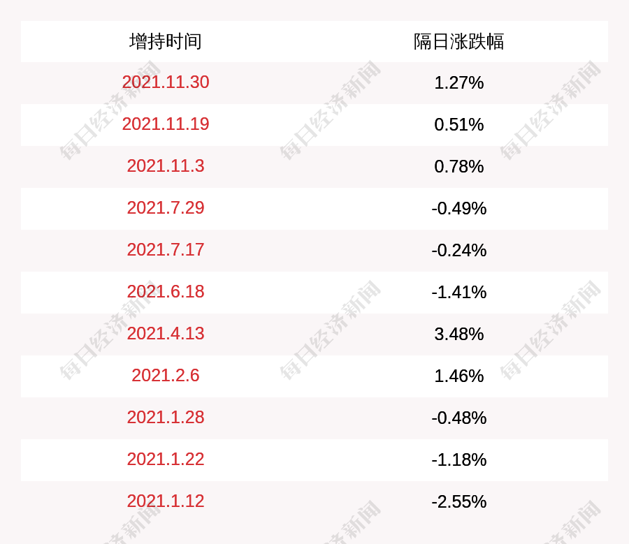3. 东百集团上次发布增持公告是2021年11月30日,第二个交易日上涨1.27%,东百集团近一年共发布12次增持类公告。