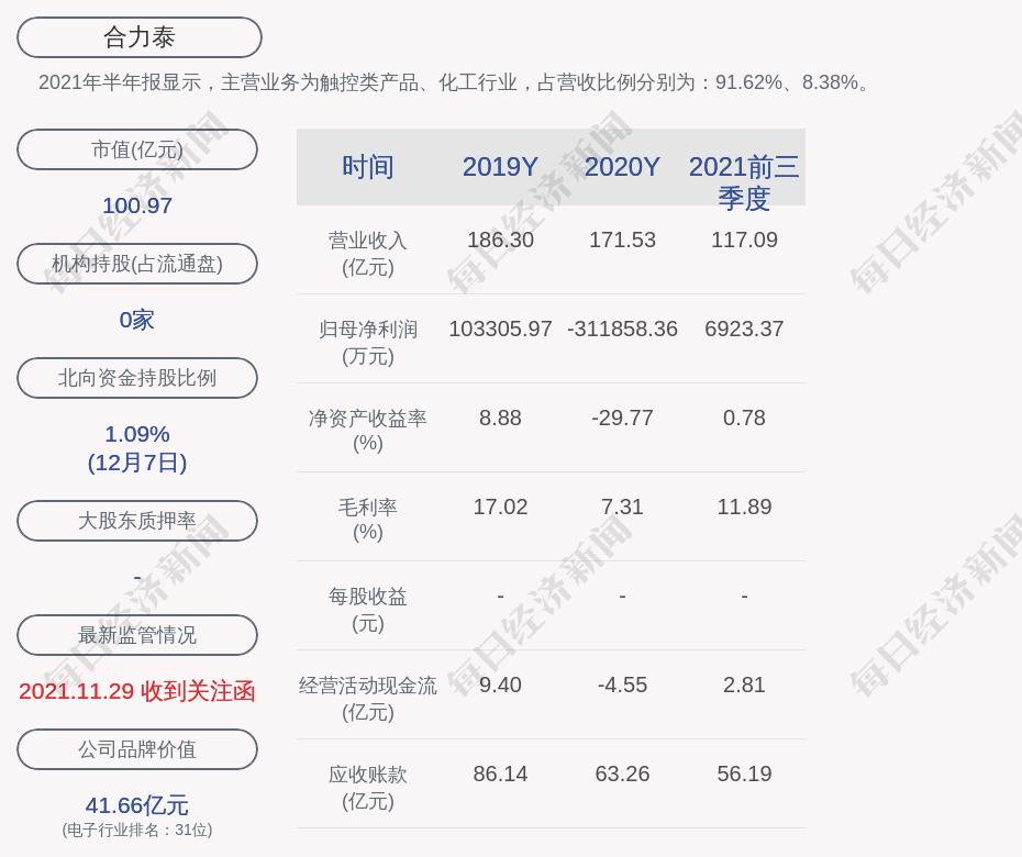 2021年半年报显示,合力泰的主营业务为触控类产品、化工行业,占营收比例分别为:91.62%、8.38%。