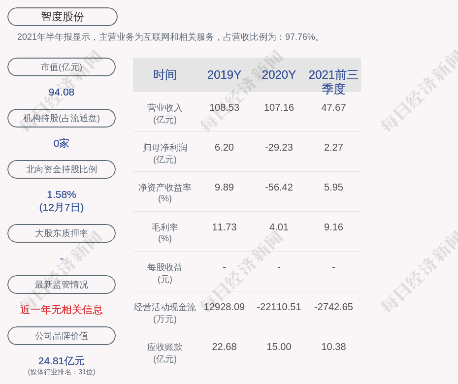 2021年半年报显示,智度股份的主营业务为互联网和相关服务,占营收比例为:97.76%。