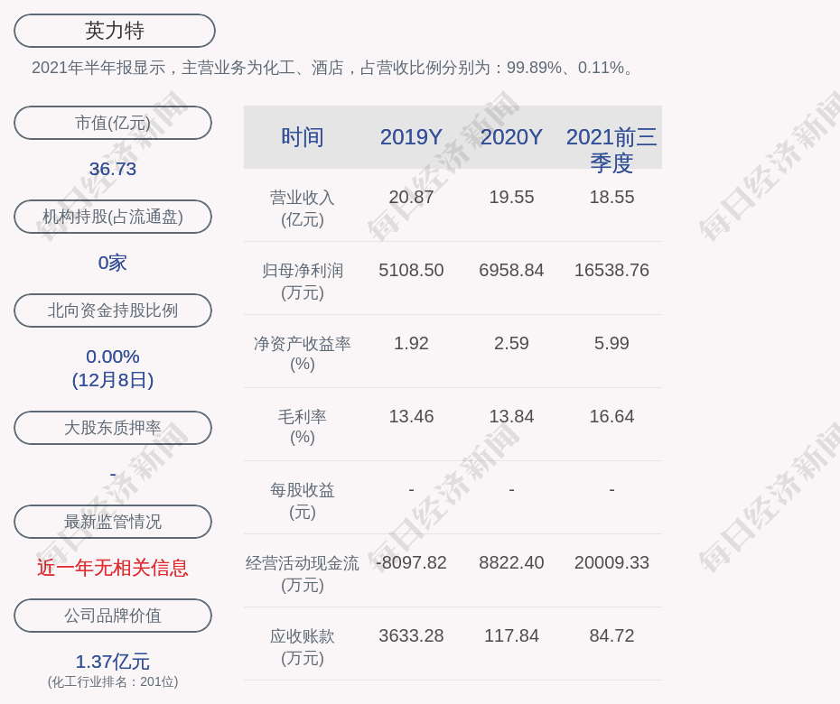 2021年半年报显示,英力特的主营业务为化工、酒店,占营收比例分别为:99.89%、0.11%。