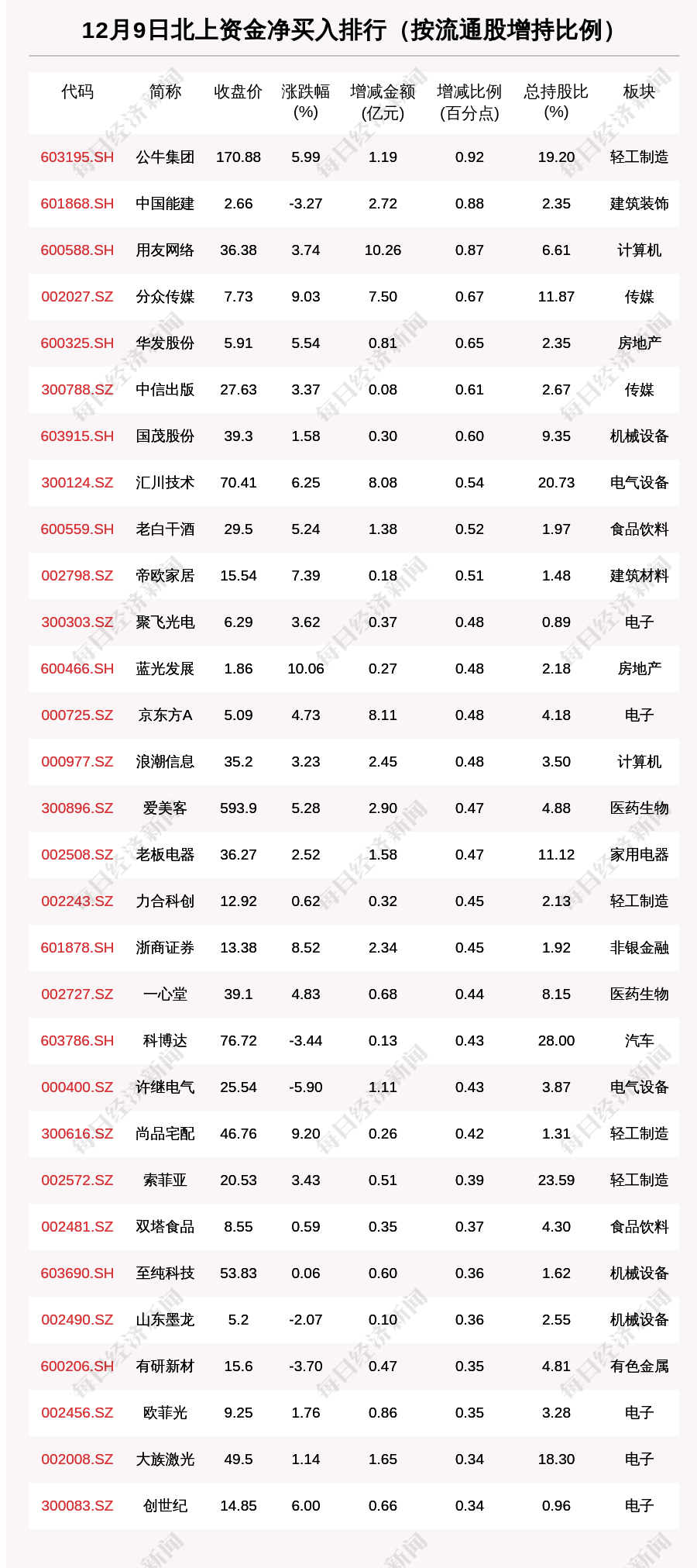 每经AI快讯,12月9日,北上资金净买入的个股共有801只,北上资金加仓比例超1%的有686只。其中,公牛集团(603195.SH,收盘价:170.88元)加仓比例最为明显,最新持股比例19.20%,环比增加0.92个百分点。其他北上资金加仓比例较多的个股还包括中国能建(601868.SH,收盘价:2.66元)、用友网络(600588.SH,收盘价:36.38元)、分众传媒(002027.SZ,收盘价:7.73元)。