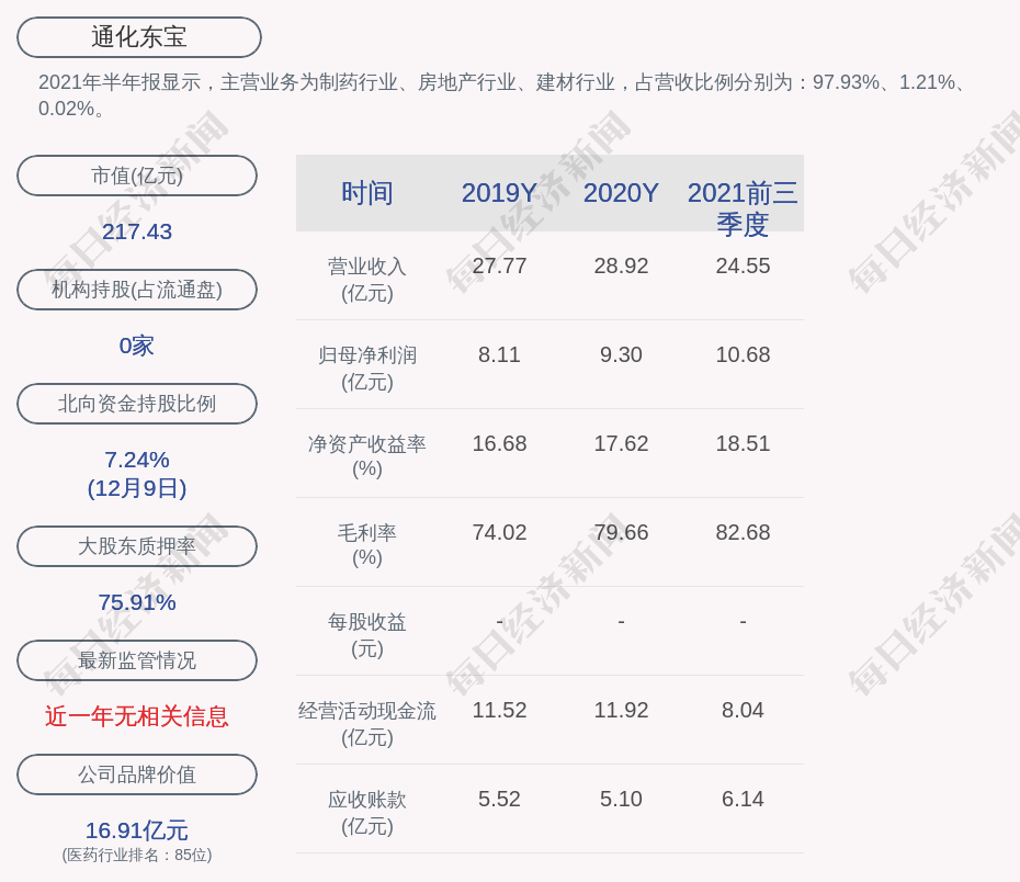 2021年半年报显示,通化东宝的主营业务为制药行业、房地产行业、建材行业,占营收比例分别为:97.93%、1.21%、0.02%。