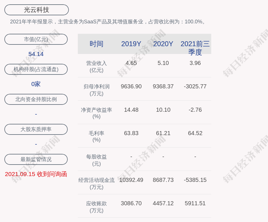 2021年半年报显示,光云科技的主营业务为SaaS产品及其增值服务业,占营收比例为:100.0%。