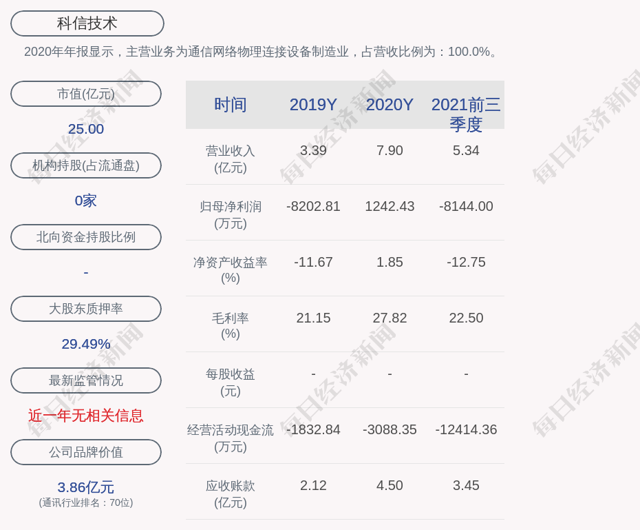 2020年年报显示,科信技术的主营业务为通信网络物理连接设备制造业,占营收比例为:100.0%。