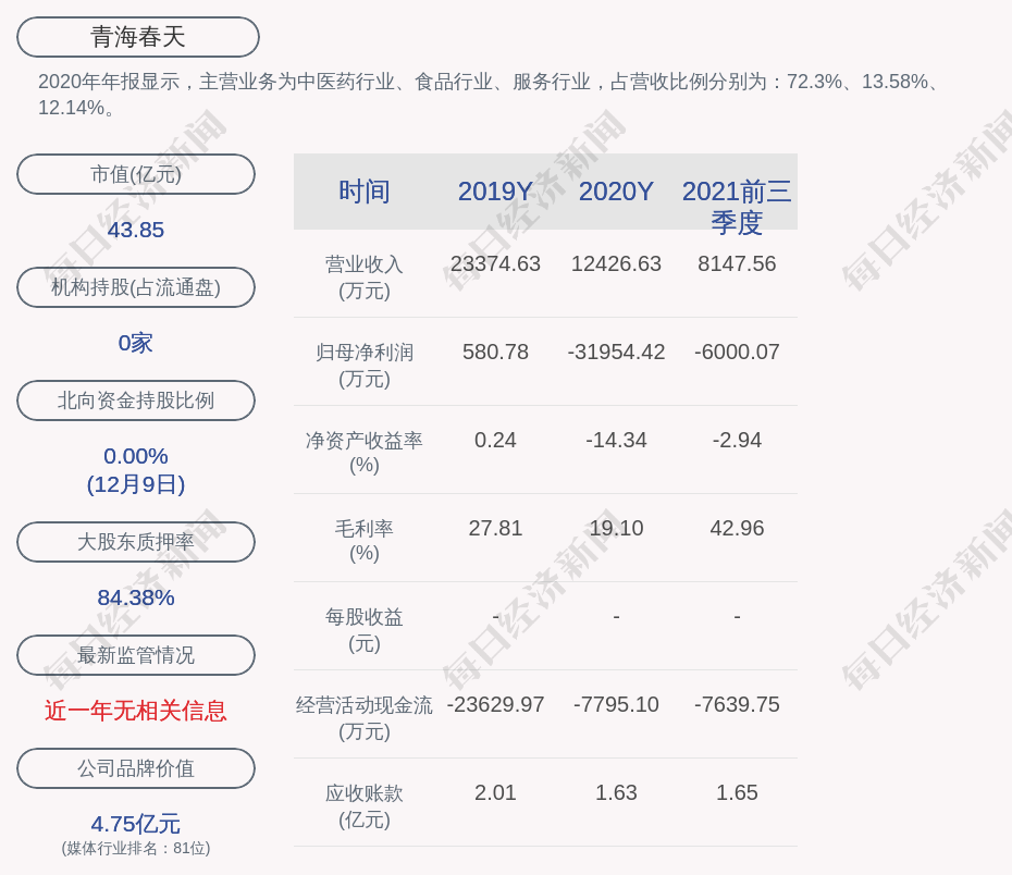2020年年报显示,青海春天的主营业务为中医药行业、食品行业、服务行业,占营收比例分别为:72.3%、13.58%、12.14%。