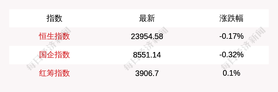 每经AI快讯:北京时间12月13日16:00,恒生指数收盘下跌41.14点,跌幅为0.17%,报收23954.58点;国企指数收盘下跌27.19点,跌幅为0.32%,报收8551.14点;红筹指数收盘上涨3.77点,涨幅为0.1%,报收3906.7点。南向资金当日净流入33.28亿港元。