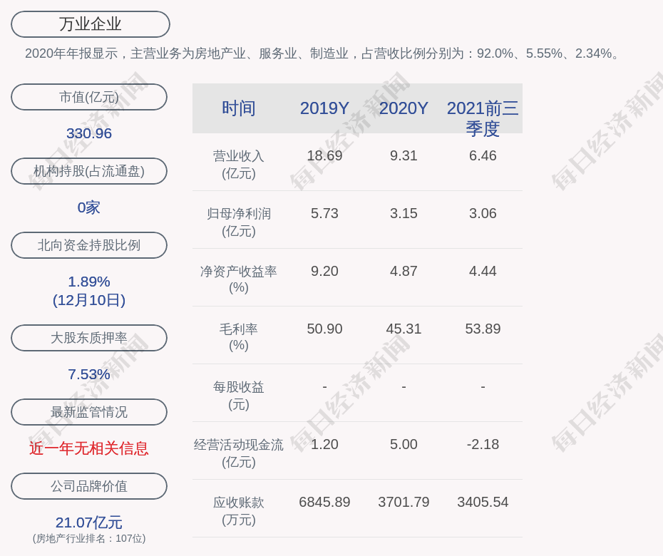 2020年年报显示,万业企业的主营业务为房地产业、服务业、制造业,占营收比例分别为:92.0%、5.55%、2.34%。