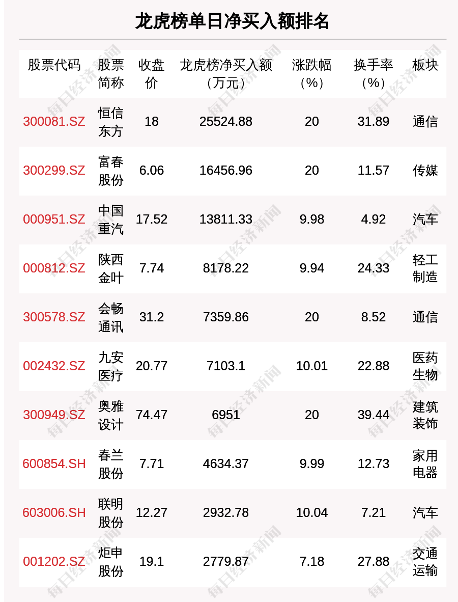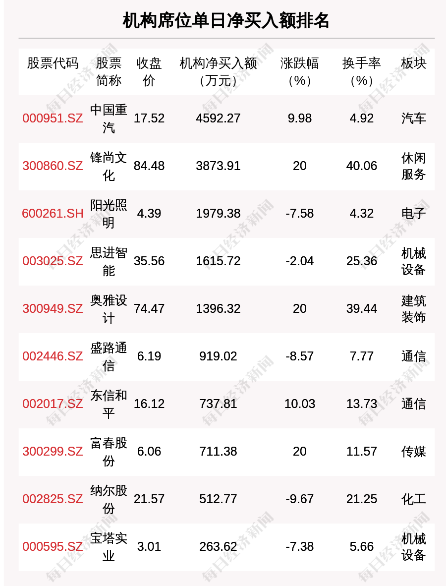 在龙虎榜中,涉及机构专用席位的个股有16只,净买入额前三的是中国重汽、锋尚文化、阳光照明,分别为4592.27万元、3873.91万元、1979.38万元。