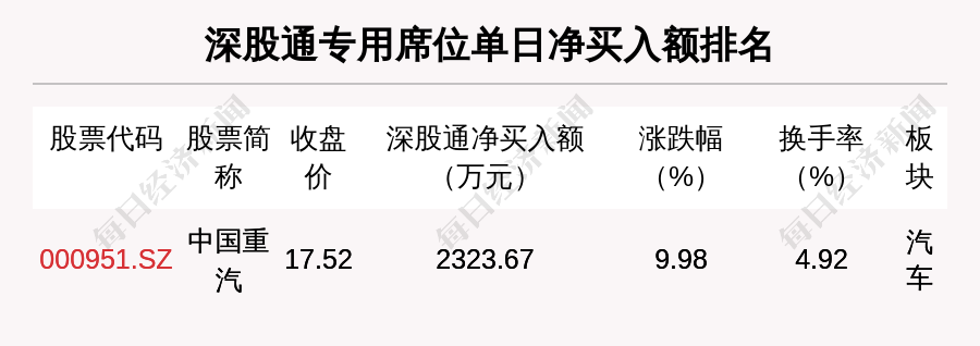 在龙虎榜中,涉及深股通专用席位的个股有1只,中国重汽的深股通专用席位净买入额最大,净买入2323.67万元。