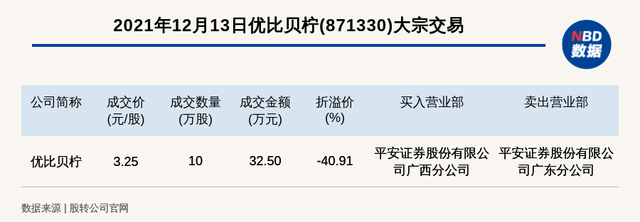 每经讯,2021年12月13日,新三板创新层公司优比贝柠(871330)发生一笔大宗交易,成交价3.25元/股,成交数量10万股,成交金额32.50万元,折价40.91%。买入营业部是平安证券股份有限公司广西分公司,卖出营业部是平安证券股份有限公司广东分公司。