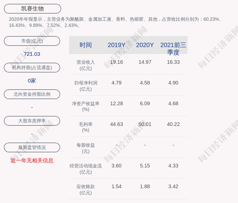 2020年年报显示,凯赛生物的主营业务为聚酰胺、金属加工液、香料、热熔胶、其他,占营收比例分别为:60.23%、16.43%、9.89%、7.52%、2.43%。