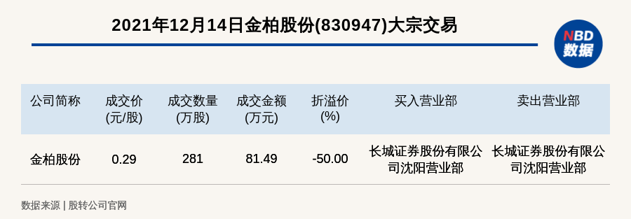 每经讯,2021年12月14日,新三板基础层公司金柏股份(830947)发生一笔大宗交易,成交价0.29元/股,成交数量281万股,成交金额81.49万元,折价50%。买入营业部是长城证券股份有限公司沈阳营业部,卖出营业部是长城证券股份有限公司沈阳营业部。