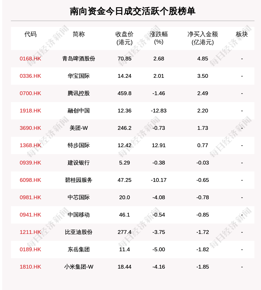 南向资金成交活跃个股榜单中,净买入个股共6只,金额最多的是青岛啤酒股份(0168.HK,收盘价:70.85港元),净买入4.853亿港元;净卖出个股共7只,金额最多的是小米集团-W(1810.HK,收盘价:18.44港元),净卖出1.847亿港元。