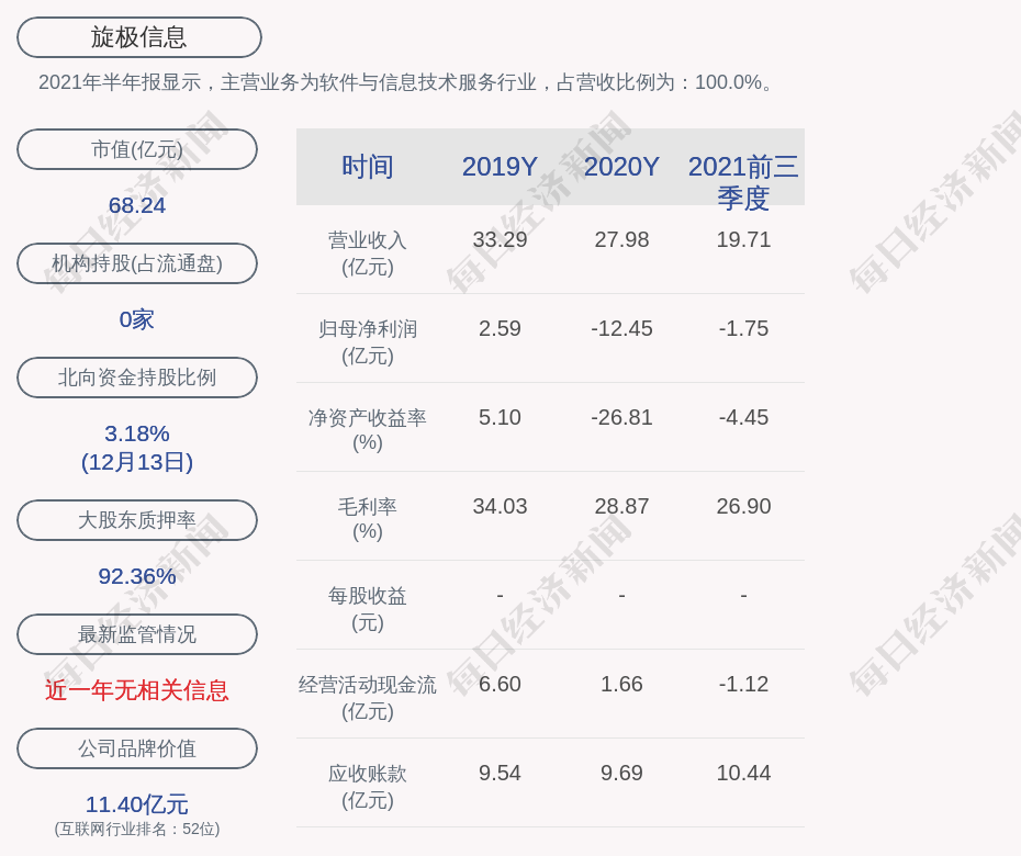 2021年半年报显示,旋极信息的主营业务为软件与信息技术服务行业,占营收比例为:100.0%。