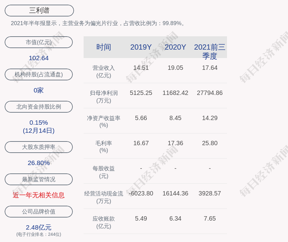 2021年半年报显示,三利谱的主营业务为偏光片行业,占营收比例为:99.89%。