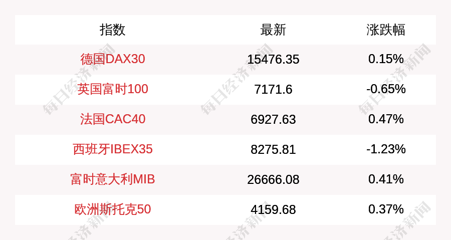 每经AI快讯:北京时间12月16日00:30,德国DAX30指数收盘上涨22.79点,涨幅为0.15%,报收15476.35点;英国富时100指数收盘下跌47.04点,跌幅为0.65%,报收7171.6点;法国CAC40指数收盘上涨32.32点,涨幅为0.47%,报收6927.63点;西班牙IBEX35指数收盘下跌102.69点,跌幅为1.23%,报收8275.81点;富时意大利MIB指数收盘上涨109.41点,涨幅为0.41%,报收26666.08点;欧洲斯托克50指数收盘上涨15.17点,涨幅为0.37%,报收4159.68点。