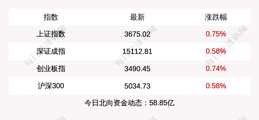 每经AI快讯:北京时间12月16日15:00,上证指数收盘上涨27.39点,涨幅为0.75%,报收3675.02点,成交额4659.11亿元;深证成指收盘上涨86.6点,涨幅为0.58%,报收15112.81点,成交额6476.8亿元;创业板指收盘上涨25.69点,涨幅为0.74%,报收3490.45点,成交额2724.31亿元;沪深300收盘上涨28.83点,涨幅为0.58%,报收5034.73点,成交额2914.75亿元。北上资金当日净流入58.85亿元。