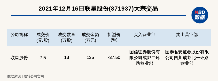 每经讯,2021年12月16日,新三板创新层公司联星股份(871937)发生一笔大宗交易,成交价7.5元/股,成交数量18万股,成交金额135万元,折价37.5%。买入营业部是国信证券股份有限公司成都二环路营业部,卖出营业部是国泰君安证券股份有限公司四川成都北一环路营业部。
