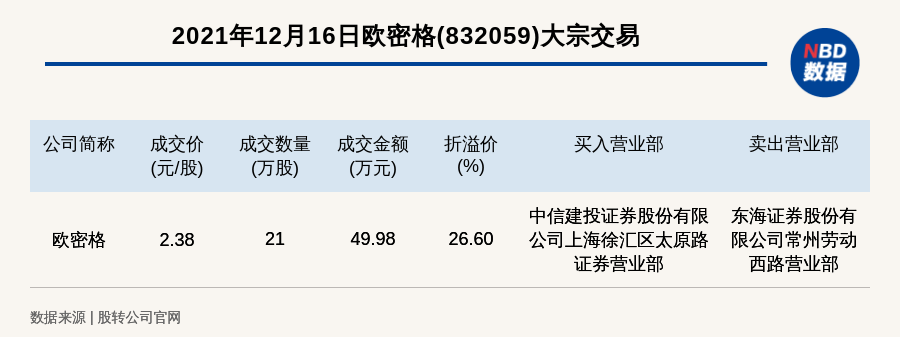 每经讯,2021年12月16日,新三板基础层公司欧密格(832059)发生一笔大宗交易,成交价2.38元/股,成交数量21万股,成交金额49.98万元,溢价26.6%。买入营业部是中信建投证券股份有限公司上海徐汇区太原路证券营业部,卖出营业部是东海证券股份有限公司常州劳动西路营业部。
