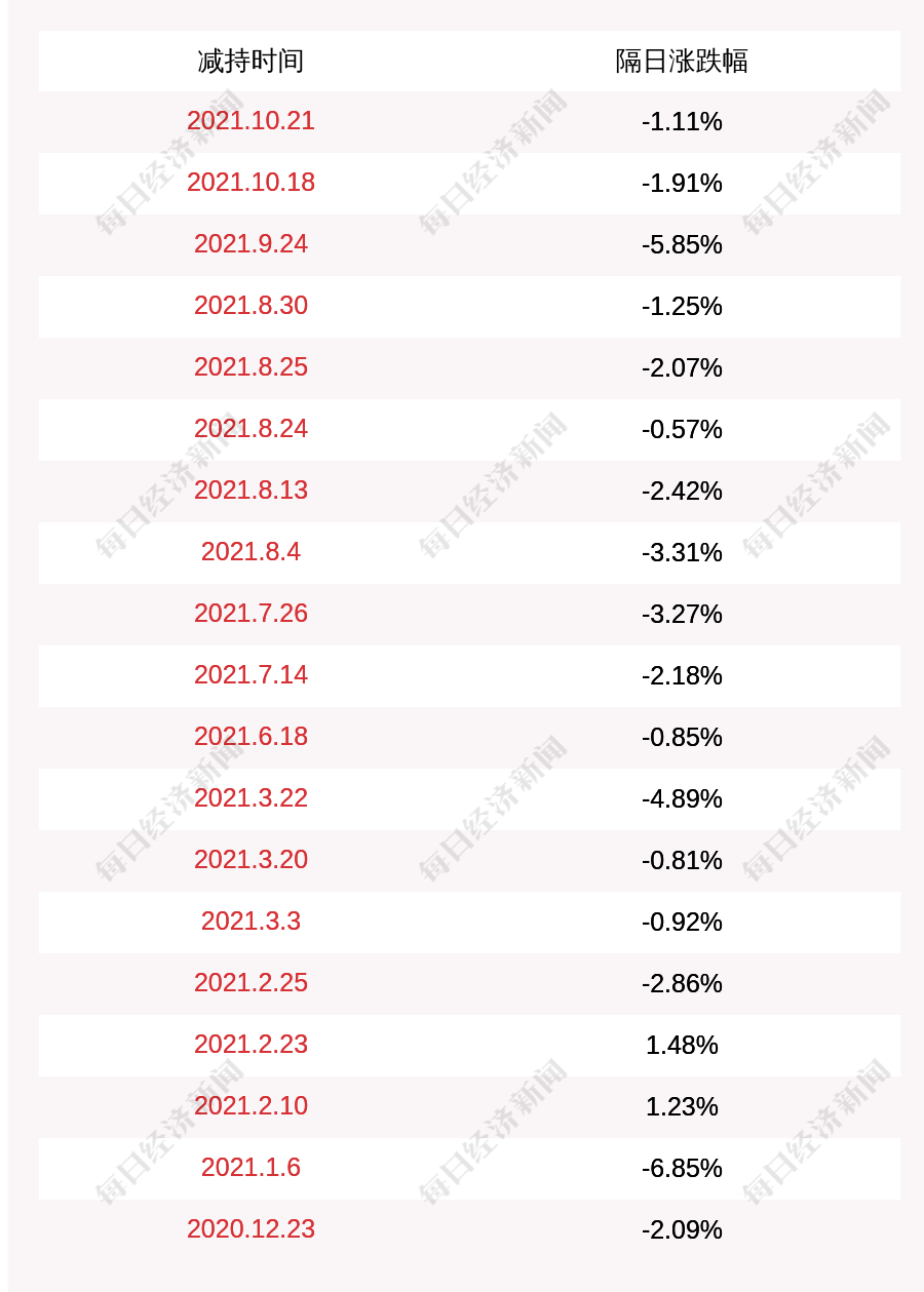 2. 农尚环境上次发布减持公告是2021年10月21日,第二个交易日下跌1.11%,农尚环境近一年共发布20次减持类公告。