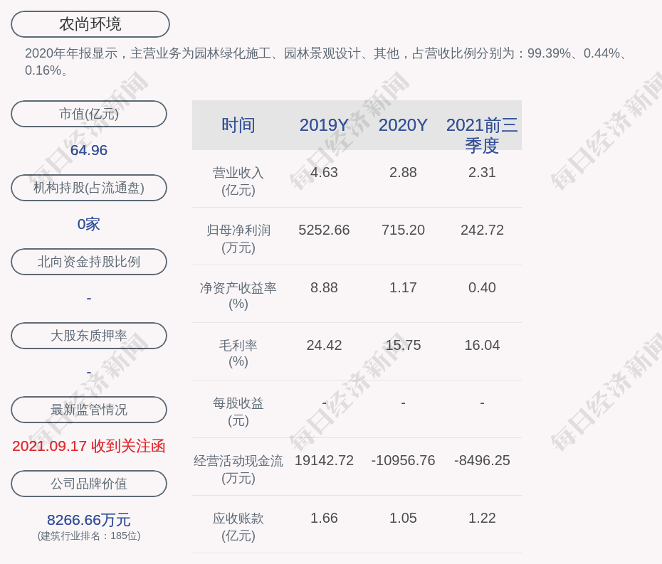 2020年年报显示,农尚环境的主营业务为园林绿化施工、园林景观设计、其他,占营收比例分别为:99.39%、0.44%、0.16%。