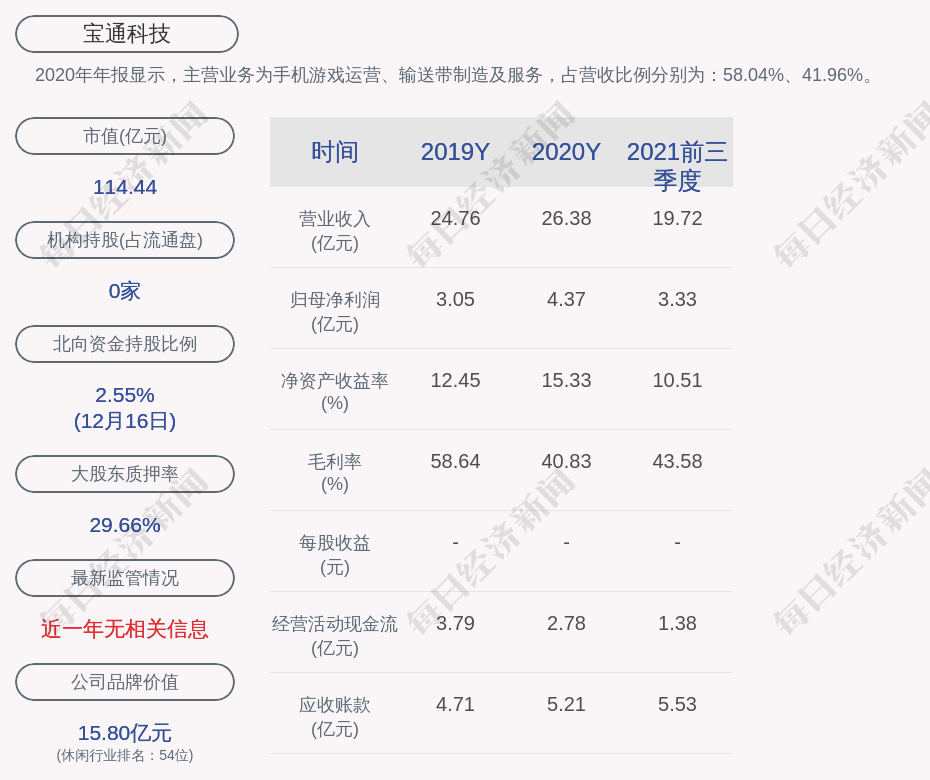 2020年年报显示,宝通科技的主营业务为手机游戏运营、输送带制造及服务,占营收比例分别为:58.04%、41.96%。