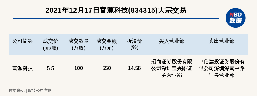 每经讯,2021年12月17日,新三板基础层公司富源科技(834315)发生一笔大宗交易,成交价5.5元/股,成交数量100万股,成交金额550万元,溢价14.58%。买入营业部是招商证券股份有限公司深圳宝兴路证券营业部,卖出营业部是中信建投证券股份有限公司深圳深南中路证券营业部。