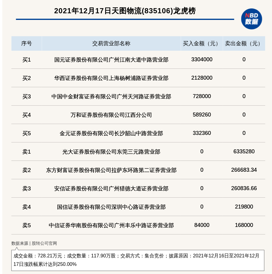 每经讯,2021年12月17日,新三板基础层公司天图物流(835106)登上龙虎榜,交易方式是集合竞价,披露原因是2021年12月16日至2021年12月17日涨跌幅累计达到250.00%,成交数量117.90万股,成交金额728.21万元。买一席位为国元证券股份有限公司广州江南大道中路营业部,买入330.40万元;卖一席位为光大证券股份有限公司东莞三元路营业部,卖出633.53万元。