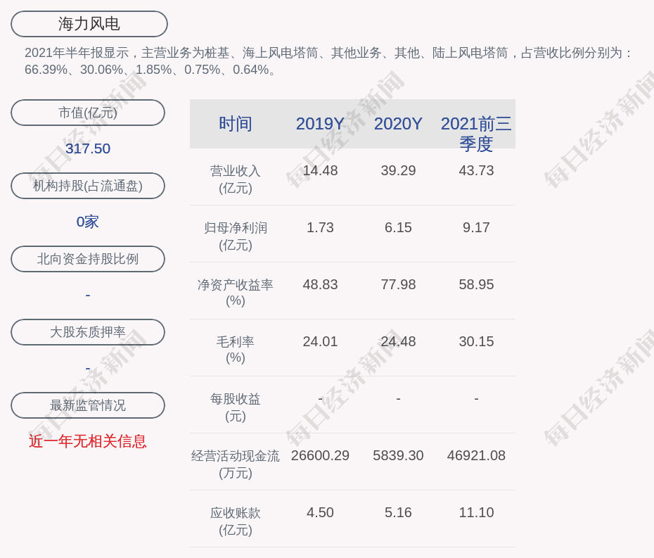 2021年半年报显示,海力风电的主营业务为桩基、海上风电塔筒、其他业务、其他、陆上风电塔筒,占营收比例分别为:66.39%、30.06%、1.85%、0.75%、0.64%。