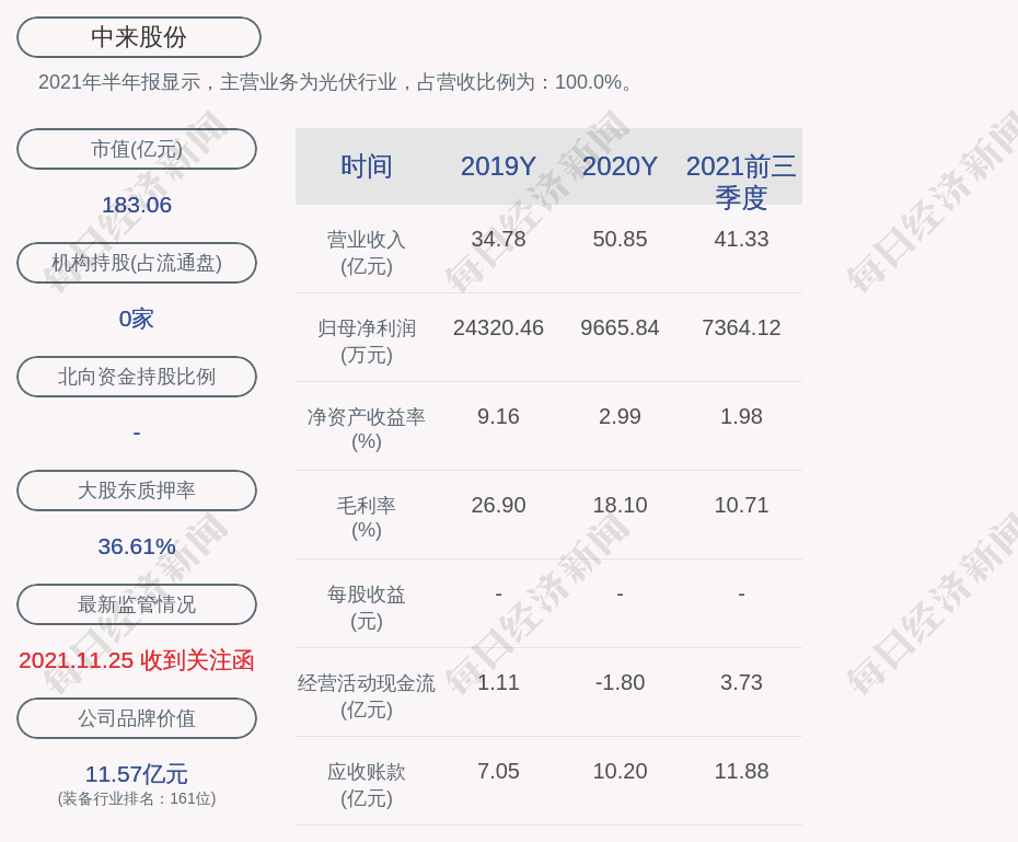 2021年半年报显示,中来股份的主营业务为光伏行业,占营收比例为:100.0%。