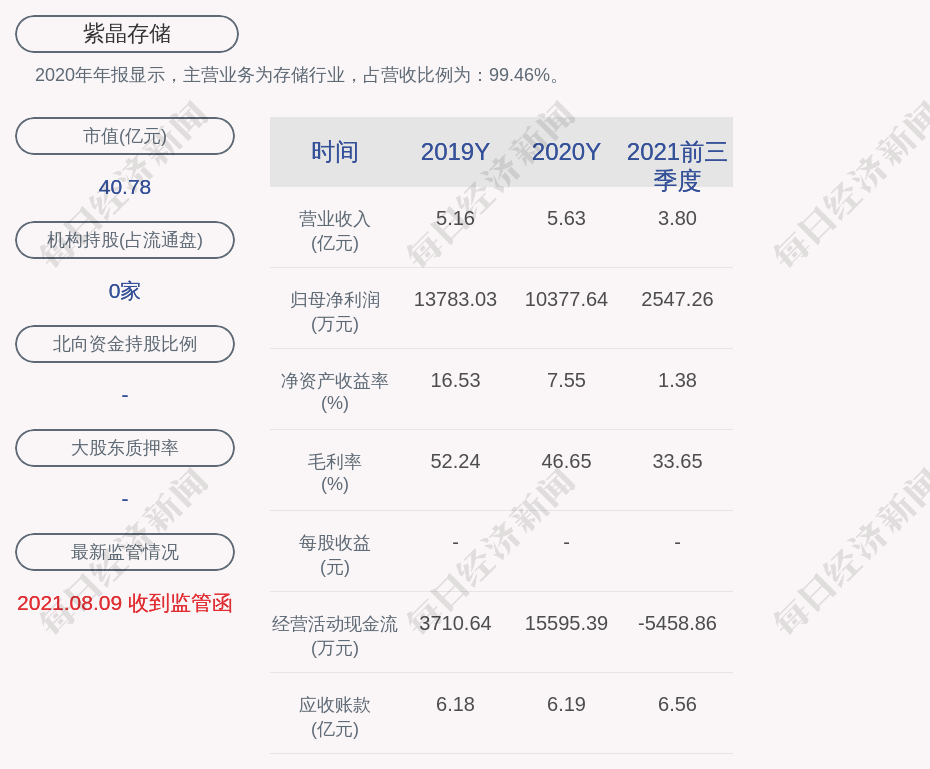 2020年年报显示,紫晶存储的主营业务为存储行业,占营收比例为:99.46%。
