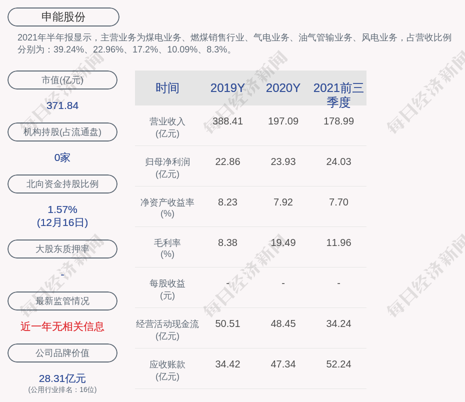 2021年半年报显示,申能股份的主营业务为煤电业务、燃煤销售行业、气电业务、油气管输业务、风电业务,占营收比例分别为:39.24%、22.96%、17.2%、10.09%、8.3%。