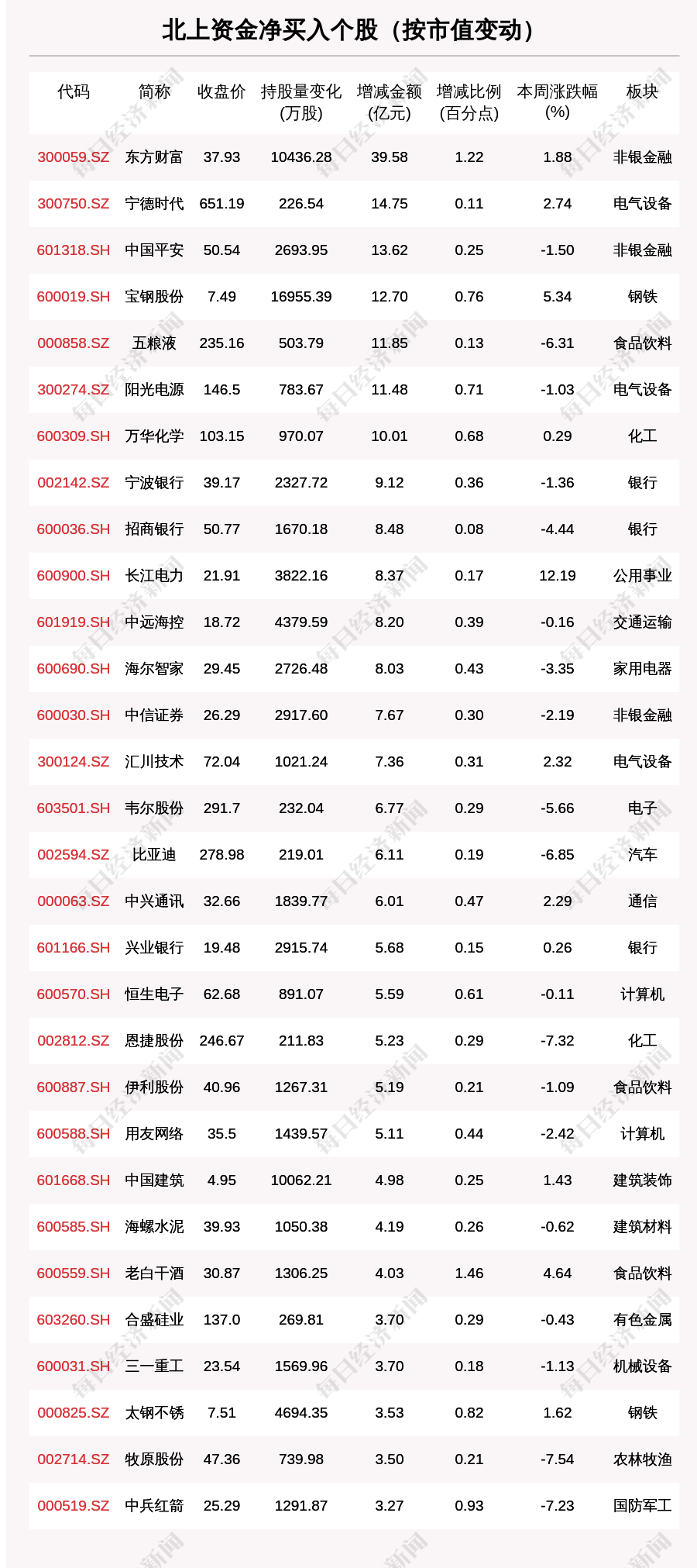 按照北向资金增持市值排序,东方财富(300059.SZ,收盘价:37.93元)增持市值最大,增持市值39.585亿元,环比增加13.29%。其他北上资金增持市值较多的个股还包括宁德时代(300750.SZ,收盘价:651.19元)、中国平安(601318.SH,收盘价:50.54元)、宝钢股份(600019.SH,收盘价:7.49元)。