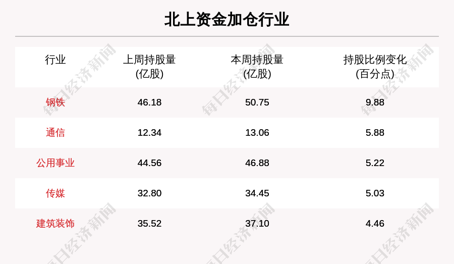 本周北上资金加仓的行业共有14个。其中,钢铁行业加仓最明显,北上资金持股数环比增加9.88%。其他北上资金加仓较多的行业还包括通信、公用事业、传媒。