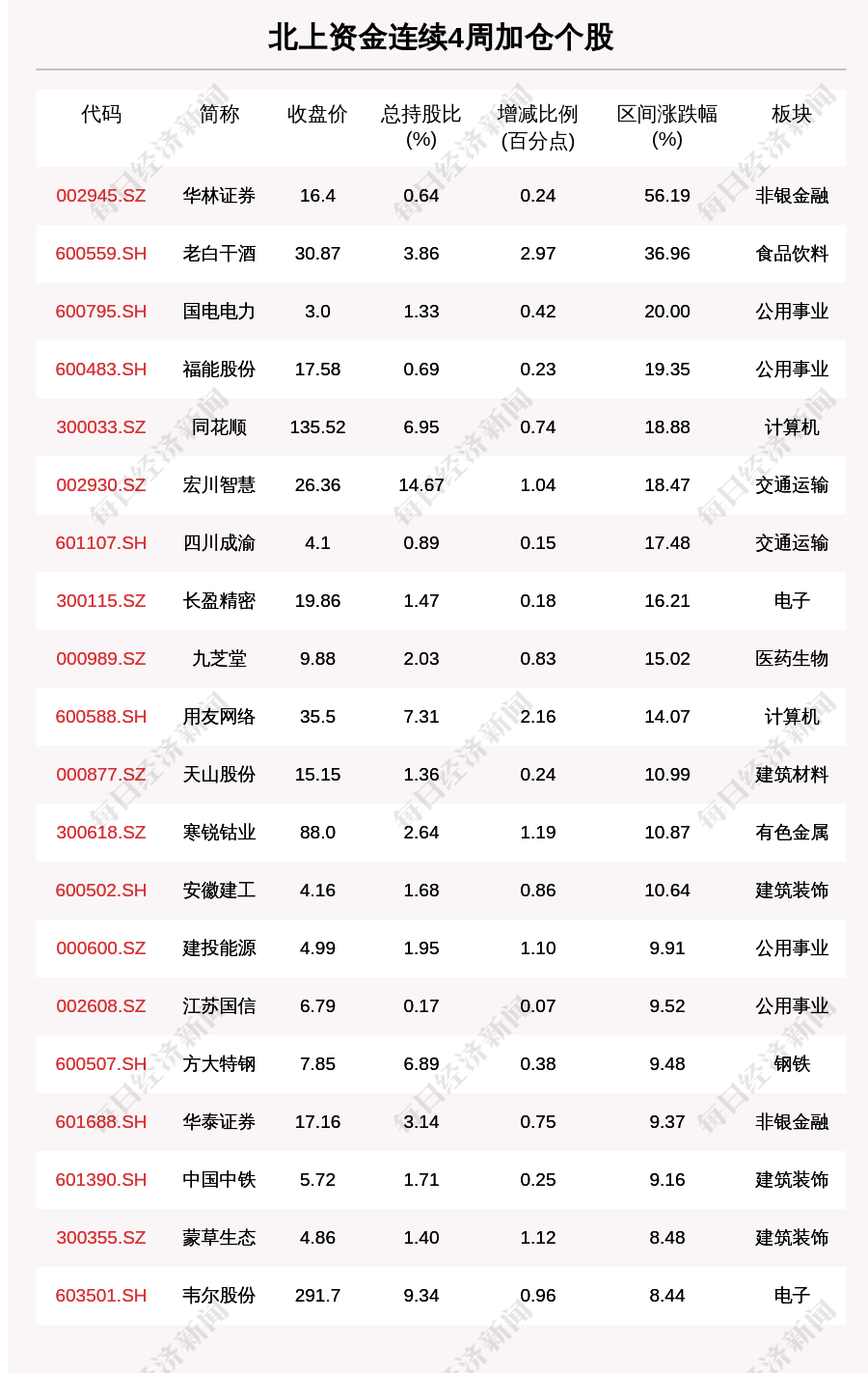 北上资金连续4周买入123个股,其中非银金融行业的个股最多,有16只。从市场表现来看,北上资金连续4周的加仓个股中,本周77只个股股价上涨,其中华林证券(002945.SZ,收盘价:16.4元)涨幅最大,上涨56.19%,其他涨幅较大的个股包括老白干酒(600559.SH,收盘价:30.87元)、国电电力(600795.SH,收盘价:3.0元)、福能股份(600483.SH,收盘价:17.58元)。