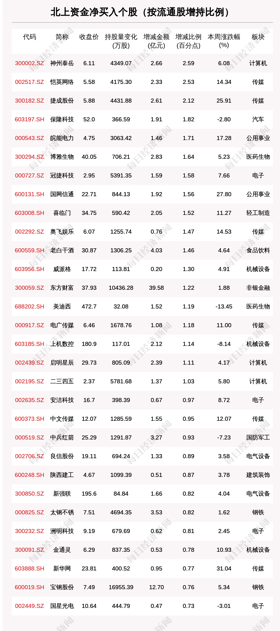 本周北上资金净买入个股共有714只,北上资金加仓比例超1%的有656只。其中,神州泰岳(300002.SZ,收盘价:6.11元)加仓比例最为明显,最新持股比例4.39%,环比增加2.65个百分点。其他北上资金加仓比例较多的个股还包括恺英网络(002517.SZ,收盘价:5.58元)、捷成股份(300182.SZ,收盘价:5.88元)、保隆科技(603197.SH,收盘价:52.0元)。