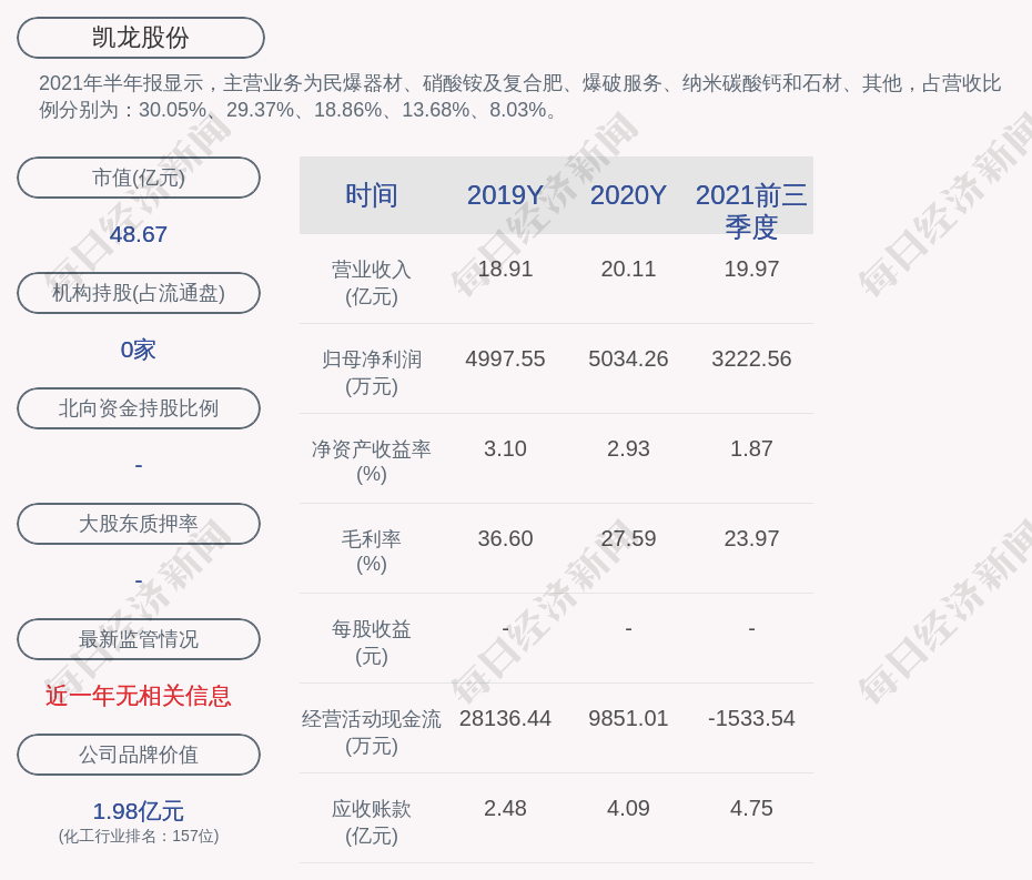 2021年半年报显示,凯龙股份的主营业务为民爆器材、硝酸铵及复合肥、爆破服务、纳米碳酸钙和石材、其他,占营收比例分别为:30.05%、29.37%、18.86%、13.68%、8.03%。
