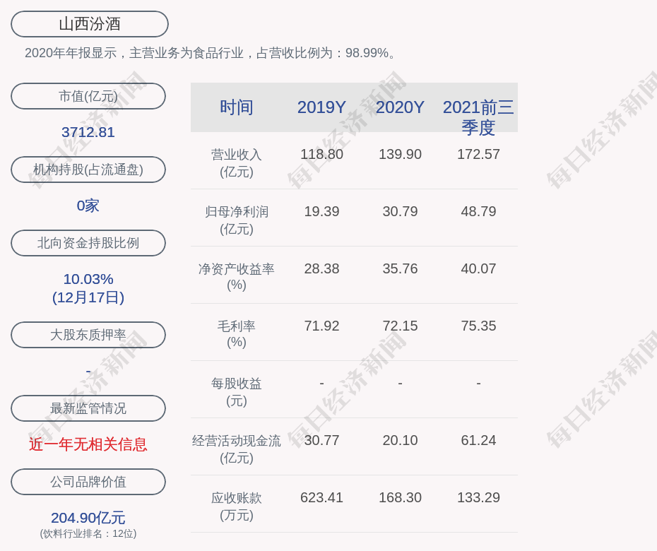 2020年年报显示,山西汾酒的主营业务为食品行业,占营收比例为:98.99%。