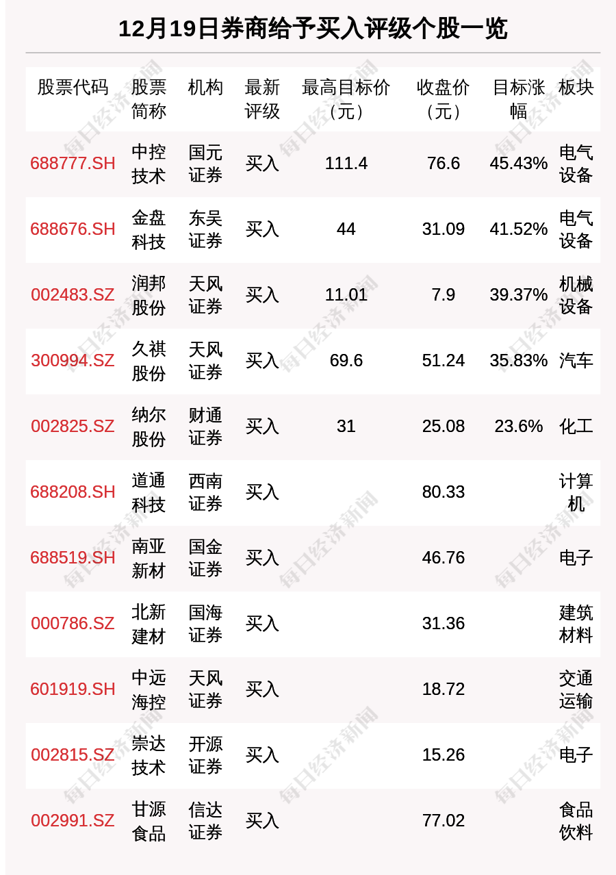 每经AI快讯,12月19日,券商给予评级的个股数共有16只,获得买入评级的个股数共有11只。在公布了目标价格的5只个股中,按照最新收盘价计算,预期涨幅排名居前的个股是中控技术(688777.SH)、金盘科技(688676.SH)、润邦股份(002483.SZ),预期涨幅分别是45.43%、41.52%、39.37%。