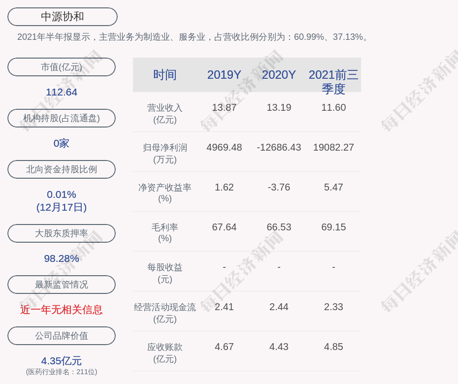 2021年半年报显示,中源协和的主营业务为制造业、服务业,占营收比例分别为:60.99%、37.13%。