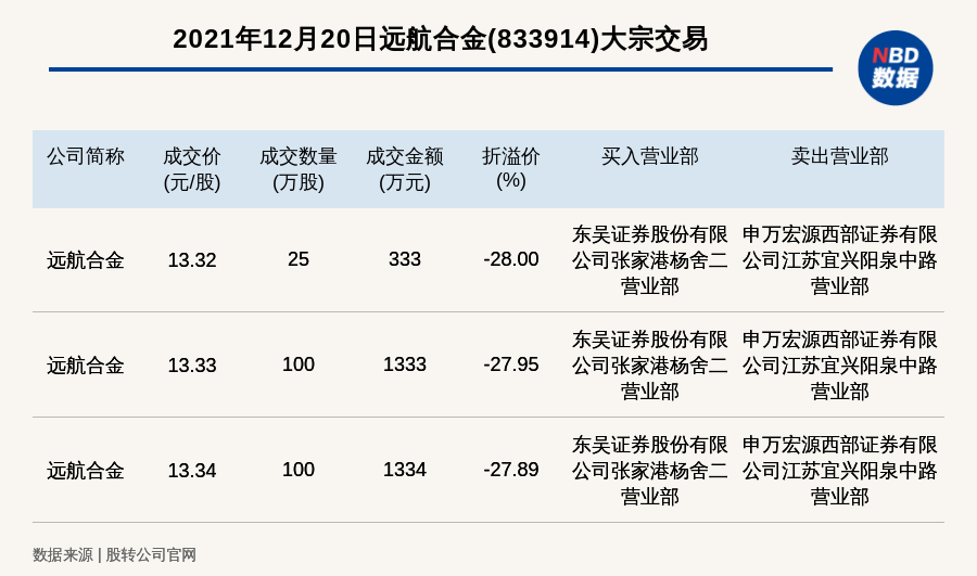 每经讯,2021年12月20日,新三板创新层公司远航合金(833914)发生3笔大宗交易,总成交金额为3000万元,成交金额最高的一笔成交价13.34元/股,成交数量100万股,成交金额1334万元,折价27.89%。买入营业部是东吴证券股份有限公司张家港杨舍二营业部,卖出营业部是申万宏源西部证券有限公司江苏宜兴阳泉中路营业部。