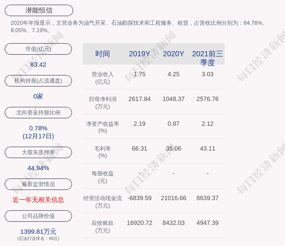 2020年年报显示,潜能恒信的主营业务为油气开采、石油勘探技术和工程服务、租赁,占营收比例分别为:84.76%、8.05%、7.19%。