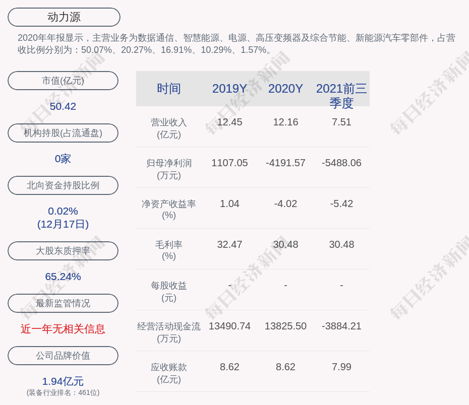 2020年年报显示,动力源的主营业务为数据通信、智慧能源、电源、高压变频器及综合节能、新能源汽车零部件,占营收比例分别为:50.07%、20.27%、16.91%、10.29%、1.57%。