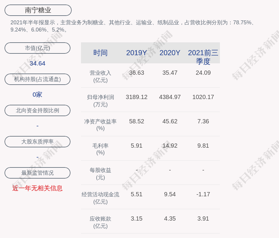 2021年半年报显示,南宁糖业的主营业务为制糖业、其他行业、运输业、纸制品业,占营收比例分别为:78.75%、9.24%、6.06%、5.2%。