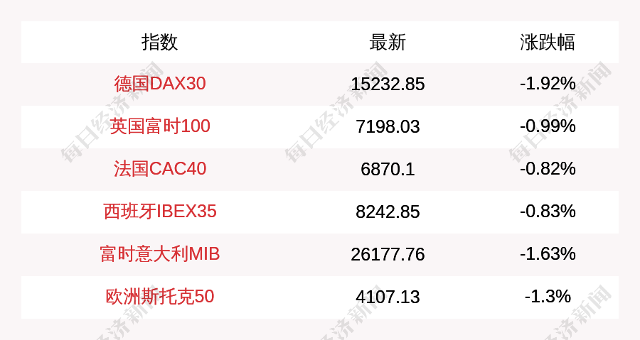 每经AI快讯:北京时间12月21日00:30,德国DAX30指数收盘下跌298.84点,跌幅为1.92%,报收15232.85点;英国富时100指数收盘下跌71.89点,跌幅为0.99%,报收7198.03点;法国CAC40指数收盘下跌56.53点,跌幅为0.82%,报收6870.1点;西班牙IBEX35指数收盘下跌68.75点,跌幅为0.83%,报收8242.85点;富时意大利MIB指数收盘下跌433.65点,跌幅为1.63%,报收26177.76点;欧洲斯托克50指数收盘下跌54.22点,跌幅为1.3%,报收4107.13点。