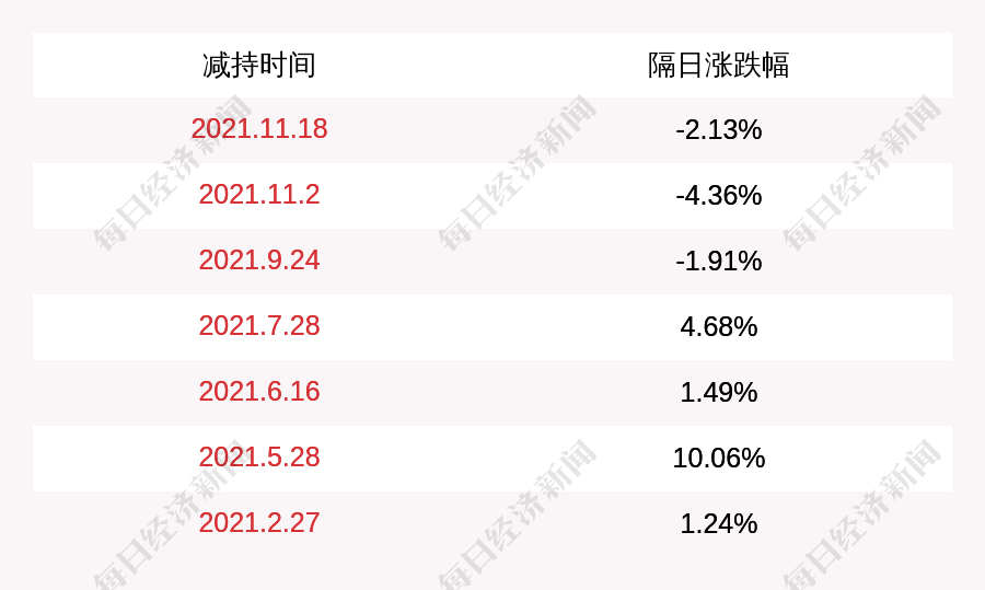 2. 金发拉比上次发布减持公告是2021年11月18日,第二个交易日下跌2.13%,金发拉比近一年共发布8次减持类公告。