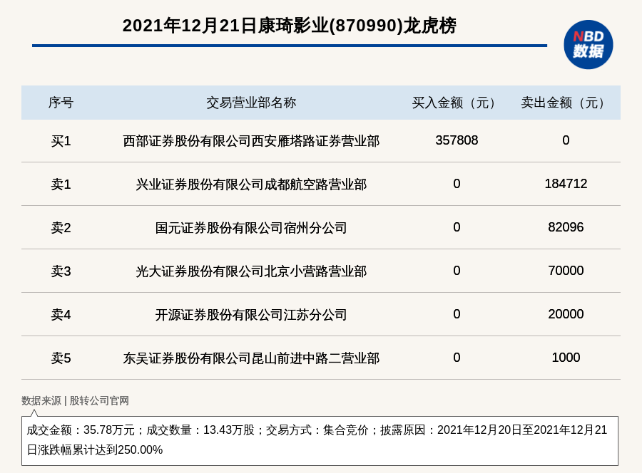 每经讯,2021年12月21日,新三板基础层公司康琦影业(870990)登上龙虎榜,交易方式是集合竞价,披露原因是2021年12月20日至2021年12月21日涨跌幅累计达到250.00%,成交数量13.43万股,成交金额35.78万元。买一席位为西部证券股份有限公司西安雁塔路证券营业部,买入35.78万元;卖一席位为兴业证券股份有限公司成都航空路营业部,卖出18.47万元。