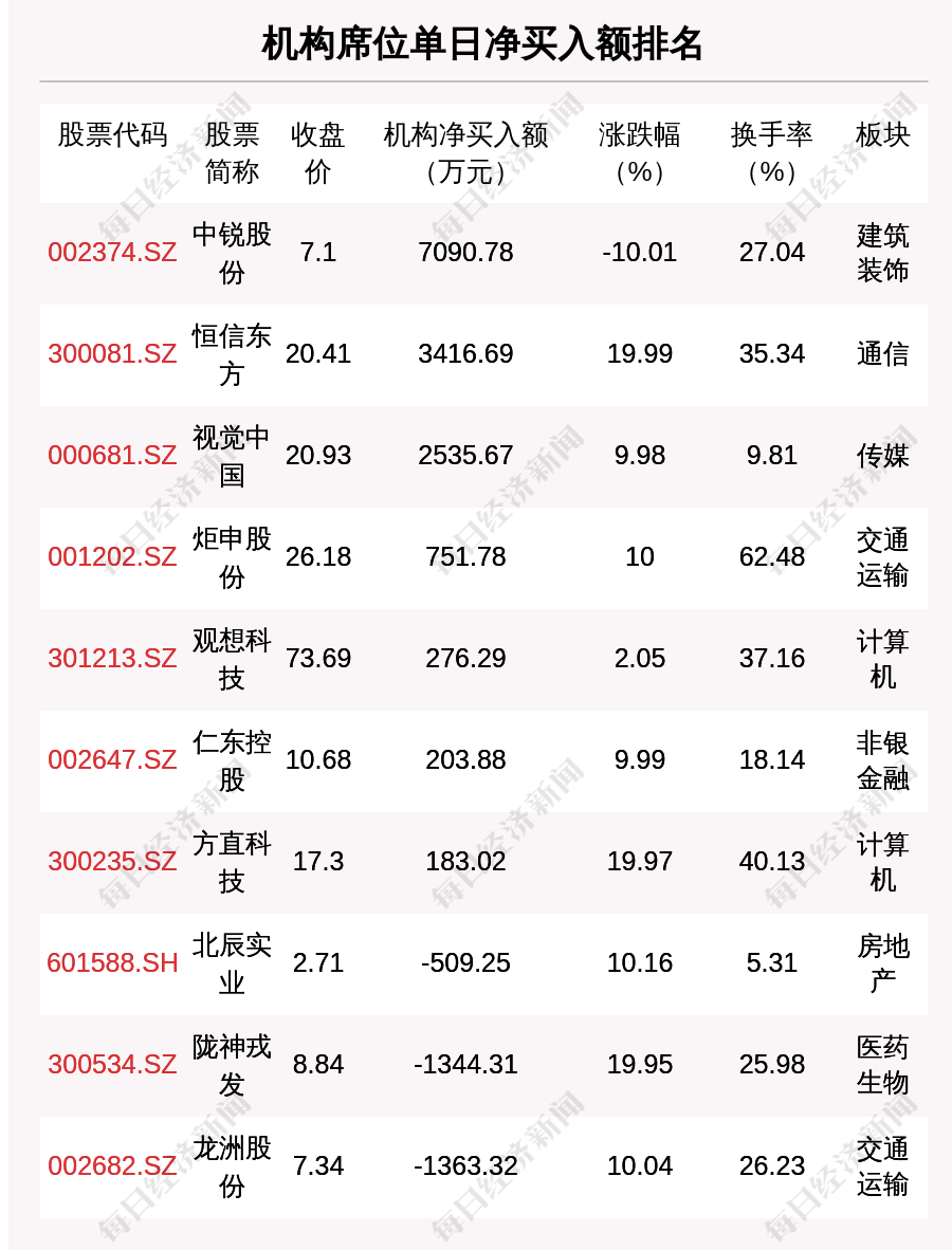 在龙虎榜中,涉及机构专用席位的个股有15只,净买入额前三的是中锐股份、恒信东方、视觉中国,分别为7090.78万元、3416.69万元、2535.67万元。