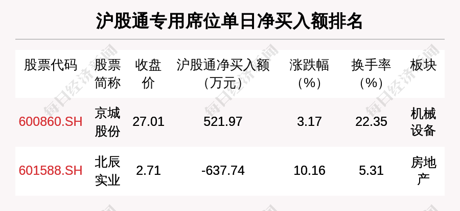 在龙虎榜中,涉及沪股通专用席位的个股有2只,京城股份的沪股通专用席位净买入额最大,净买入521.97万元。
